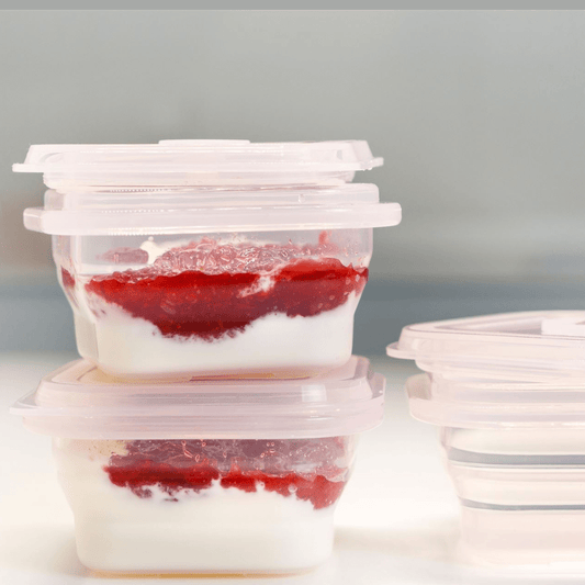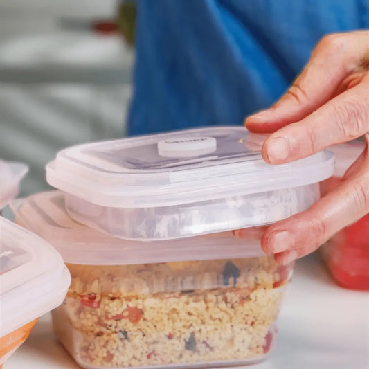 Tuppers plegables que puedes utilizar en el horno, microondas y en el congelador y cuando no los necesites los pliegas y ocupan muy poco espacio. Además plegados también los puedes utilizar para pequeñas cantidades y fiambres.